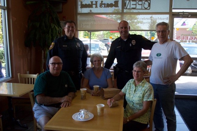The officers were participating in the national “Coffee With A Cop” program, in which police officers were stationed at various businesses in towns to meet and talk with residents.
