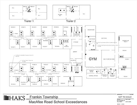 Chart showing the areas in MacAfee Road School where excessive levels of lead were found in water supplies.