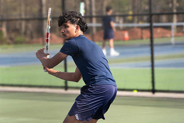 SQUARING UP – The Franklin High School boys’ tennis team scored a decisive win over Bridgewater-Raritan on April 16.