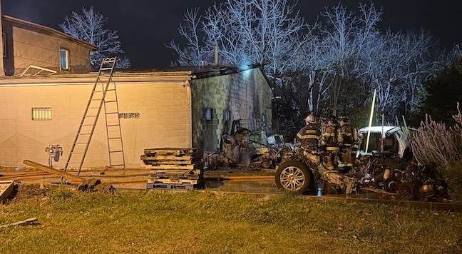 FIRE AFTERMATH – Firefighters perform after-fire review after an early morning blaze at a Route 27 auto shop. (Photo: Franklin Park Volunteer Fire Department.)
