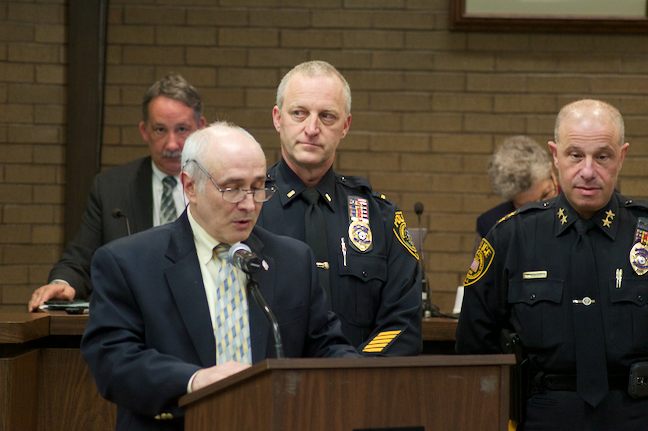 Russo, said Mayor Phillip Kramer, “is an example of our exemplary police force. There are a lot of uniforms in this room because they are proud of him.”