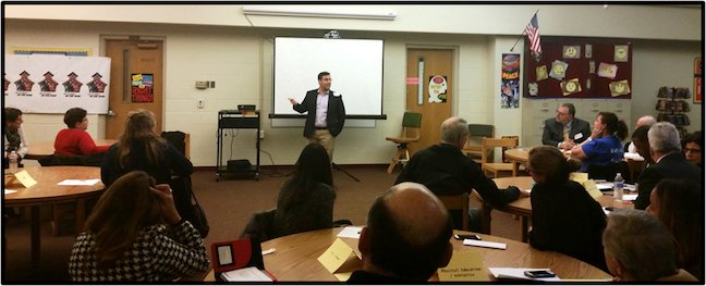 The meeting, led by schools Superintendent John A. Ravally and William Grippo, Referendum Transition Coordinator, was a first step in establishing two-way communication between the school district and the larger community with regard to: the construction of the new elementary building on Claremont Road, construction projects at several other school, grade re-configuration which will affect the school attendance boundaries and allow 5th grade students to remain in their elementary school setting, and the creation of one middle school for grades 6-8 on two campuses – at the current site of Franklin Middle School and at Sampson G. Smith School.