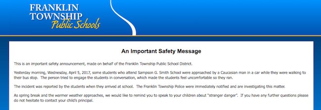 “The incident was reported by the students when they arrived at school,” the statement reads. “The Franklin Township Police were immediately notified and are investigating this matter.”