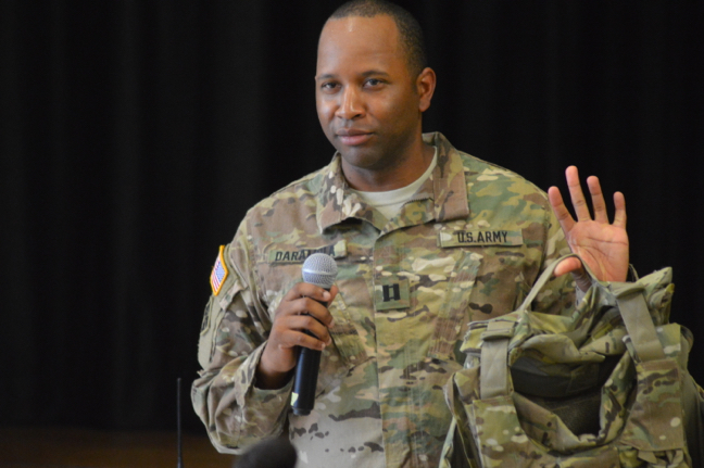 Daramola talked a bit about what he’ll be doing overseas – his unit is responsible for humanitarian aid, he said – and showed the students his helmet and bullet-proof vest.