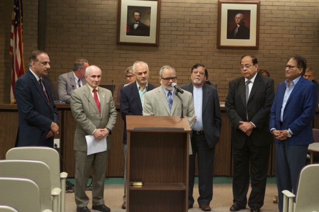 Dr. Aftab Husain speaks at the Oct. 24 Township Council while members of Masjid-e-Ali Mosque and township officials look on.