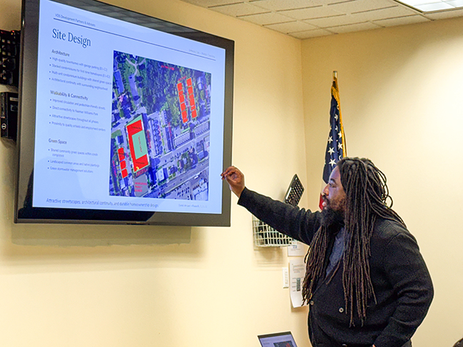 EXPLAINING THE DESIGN – Shaun Joseph, an architectural consultant for VDS Development Partners & Advisors, explains aspects to the company’s conceptual plan to finish the Renaissance 2000 project along Route 27 to the Redevelopment Agency on March 30.