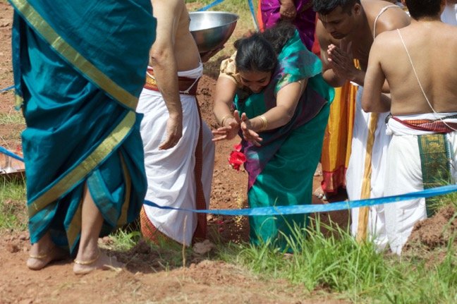 The groundbreaking ceremony was marked by religious chanting and the “pooja,” or offering of gifts. The gifts included flower petals and fruit.