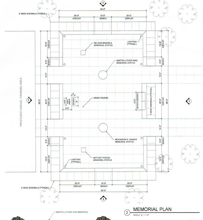The basic plan is to place bronze statues of Mohandas Gandhi and Martin Luther King, Jr. and bronze busts of Nelson Mandela and Saint Teresa of Calcutta in the monument park.
