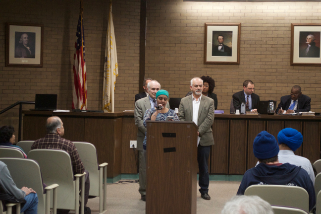 With Mayor Phil Kramer and Alex Kharazi looking on (left to right) Ardaman Singh reads a statement about the Sikh religion at the Township Council meeting.