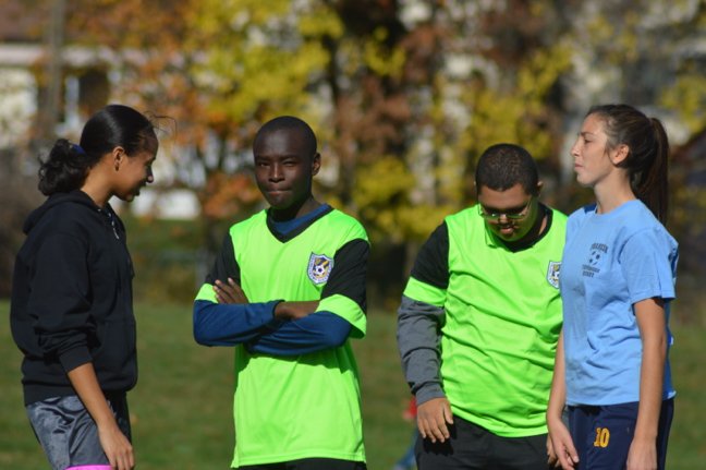 TOPSoccer players, in the green shirts, talk to their “buddy” volunteers.