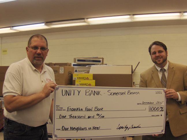 Unity Bank and its employees have donated a total of $15,000 to 15 food pantries in Central New Jersey and Pennsylvania, including to the Franklin Township Food Bank.