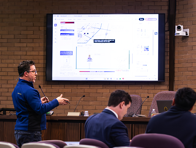 SIGN DETAILS – Clint Ehlers of Fast Signs talks about the positioning of a car wash sign on Route 27 at the April 2 Zoning Board meeting.